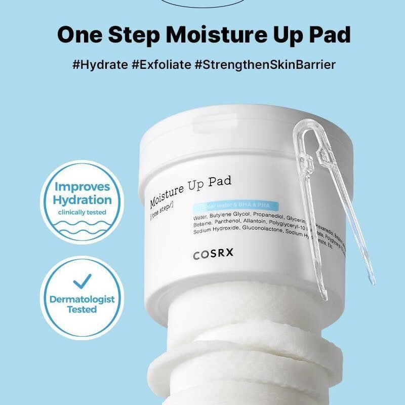 Les COSRX One Step Moisture Up Pad sont des tampons tonique double face contenant de l’eau glaciaire Alaska, du BHA et du PHA qui aident à lisser la peau et à renouveler l’hydratation pour une hydratation toute la journée. Utilisez le côté embossé pour éliminer les cellules mortes de la peau et le côté plus…