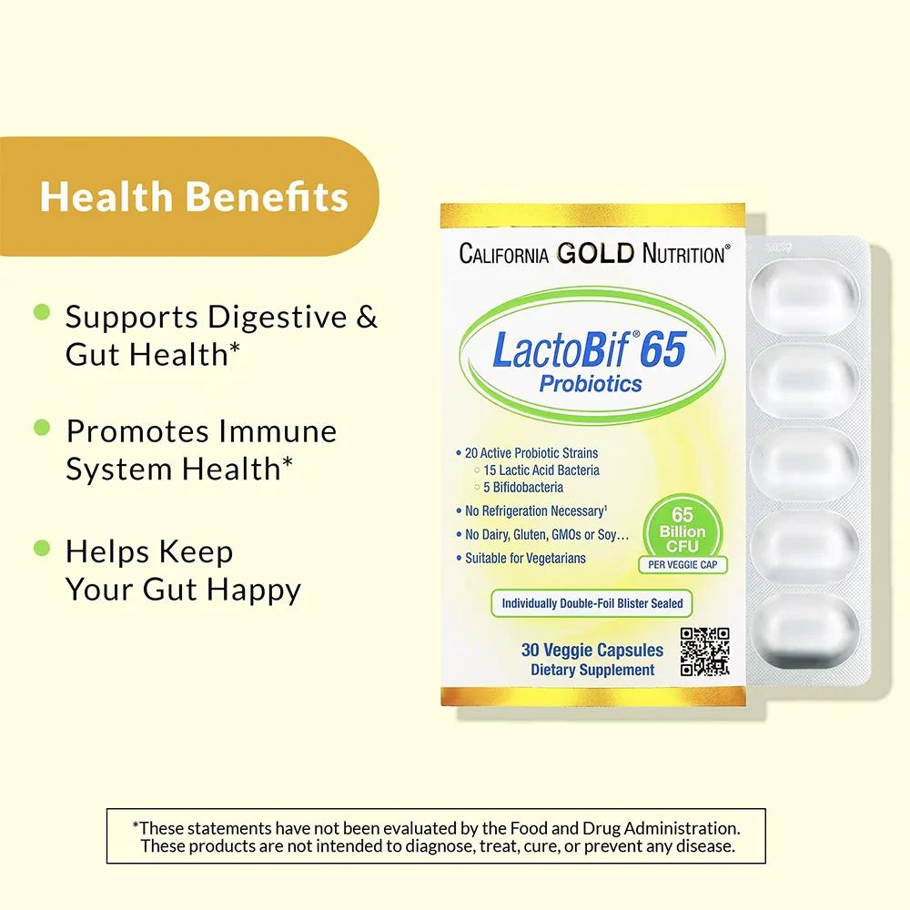 California Gold Nutrition, LactoBif 65 Probiotics, 65 Billion CFU, Dietary Supplement – 30 Veggie Capsules